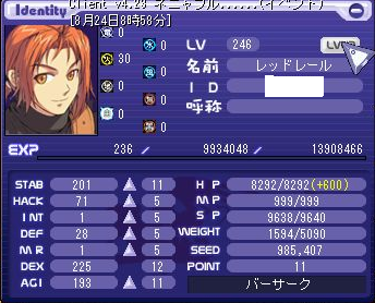 LV:246 STAB 125 HACK 4 INT 1 DEF 34 MR 1 DEX 255 AGI 255